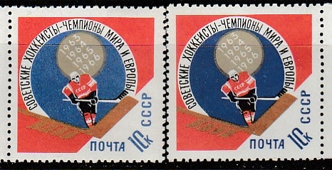 СССР 1966 год. Чемпионаты мира. Хоккей. Разновидность - разный оттенок, 2 марки.