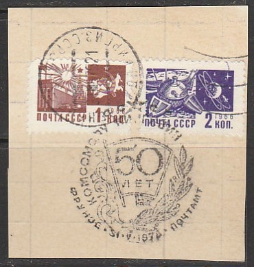 СССР 1968 год. Стандарт. Кремлёвский Дворец съездов. АМС "Луна-9", спецгашение, 2 марки (вырезка) (V) СГ: 50 лет Комсомолу Киргизии, 31.05.1975 год, Фрунзе, почтамт.