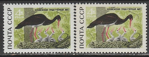 СССР 1969 год. Беловежская пуща. Чёрный аист. Разновидность - разный оттенок, 2 марки (3717)