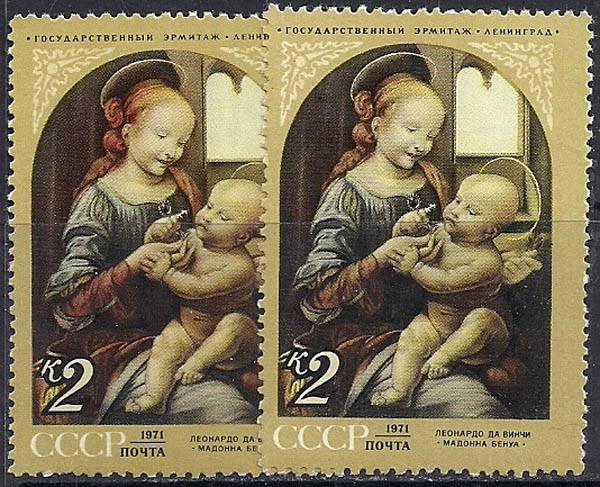 СССР 1971 год. Леонардо да Винчи "Мадонна Бенуа" (3950). Разновидность - темный желтый цвет на левой марке (Ю)