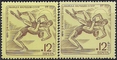 СССР 1971 год. Спартакиада. Классическая борьба (ном. 12к). Разновидность - тёмный цвет и фон. (Ю) на левой марке