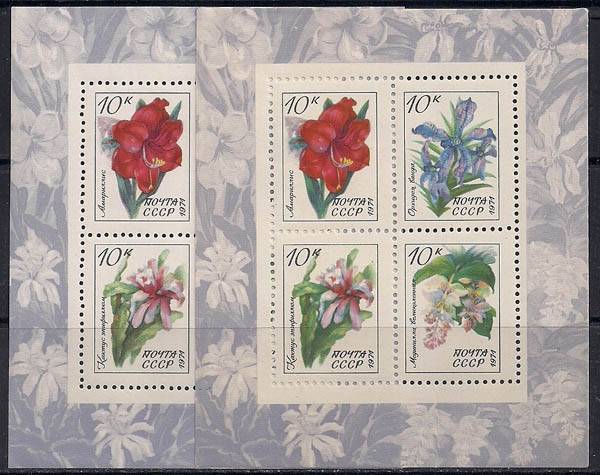 СССР 1971 год. Тропические растения (бл76). Блок с наклейкой. Разновидность - желтый фон на правом блоке.