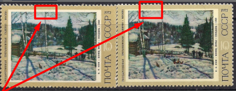 СССР 1972 год. К.Ф.Юон "Конец зимы. Полдень" (ном. 10к). Разновидность- смещение фона рисунка