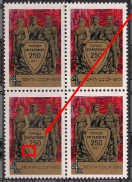 СССР 1973 год. 250 лет городу Свердловску. Квартблок. Разновидность - штрих на щите