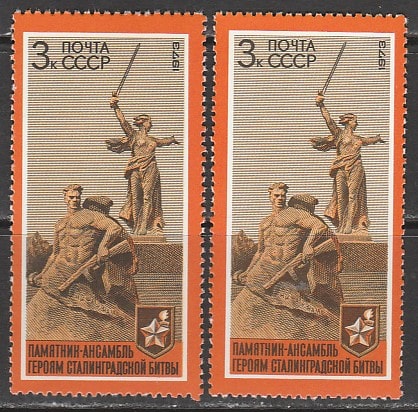 СССР 1973 год. Монументы "Стоять насмерть" и "Родина - мать". Разновидность - разный оттенок, 2 марки
