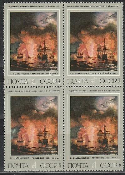 СССР 1974, Айвазовский, "Чесменский Бой", 1-я марка на Тексте Белое Пятно, квартблок