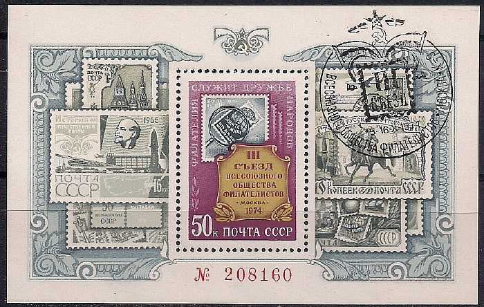 СССР 1974 год. 3-й съезд ВОФ. Блок со СГ (бл100), 15-16. 10. 1974 год, Москва. ГАШЕНИЕ МОГУТ БЫТЬ В РАЗНЫХ МЕСТАХ