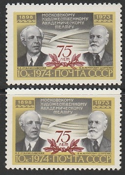 СССР 1974 год. Основатели Московского академического театра Станиславский и Немирович-Данченко. Разновидность - разный оттенок, 2 марки (4295)