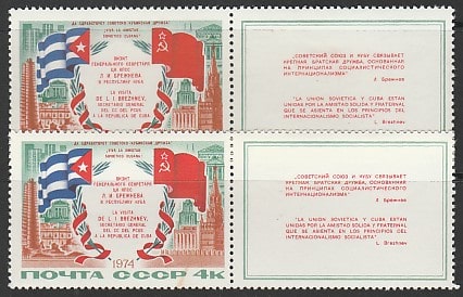 СССР 1974 год. Визит Л.И. Брежнева в Республику Куба. Разновидность - разный оттенок, 2 марки с купонами (4263)