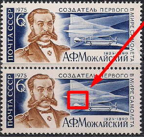 СССР 1975 год. 150 лет со дня рождения А.Ф. Можайского. Сцепка. Разновидность - точка на крыле самолета