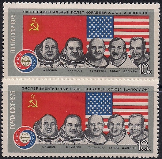 СССР 1975 год. Портреты космонавтов проекта "Союз - Аполлон" (ном. 10к). Разновидность - "темные" лица на верхней марке