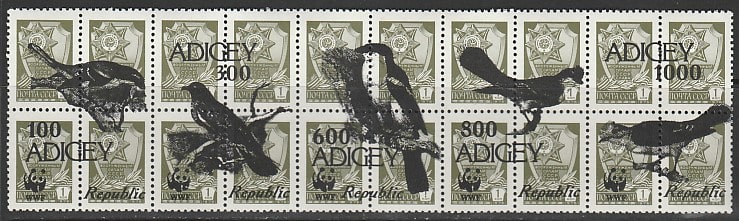 СССР 1976 год. Стандарт. Надпечатка: Почта Адыгеи. WWF: Птицы, ном. 100-1000, сцепка из 20 марок (сувенирный выпуск)