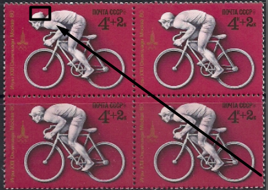 СССР 1977 год. Олимпиада в Москве. Велоспорт (ном.4к+12к). Квартблок. Разновидность - "вздутая" голова