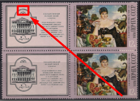 СССР 1978 год. 100 лет со дня рождения Б.М. Кустодиева. "Купчиха за чаем" (ном. 12к). Квартблок с купонами слева. Разновидность - пробита рамка на купоне