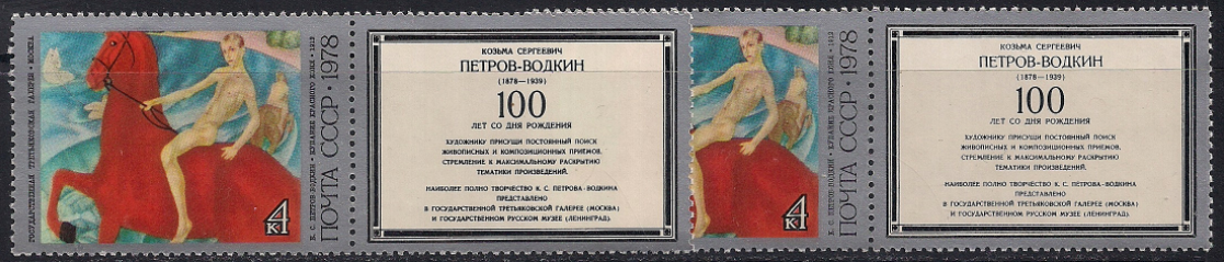 СССР 1978 год. 100 лет со дня рождения К.С. Петрова-Водкина. картина "Купание красного коня" (ном. 4к). Разновидность - жирный текст на левом купоне