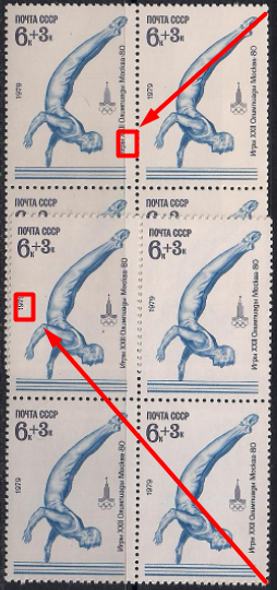 СССР 1979 год. Олимпиада в Москве. Параллельные брусья (ном. 6к+3к). Квартблок. Разновидость -белая пятно под "Ы" в "Игры" + под "9" в "1979" + серая бумага на верхнем квартблоке