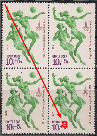 СССР 1979 год. Олимпиада в Москве. Волейбол (ном. 10к+5к). Квартблок. Разновидность - волнистый верх у "5"