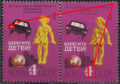 СССР 1979 год. За безопасность движения. Дети на дороге (ном. 4к). Разновидность - "волосок" в левом подфарнике + неровная ножка в "4"