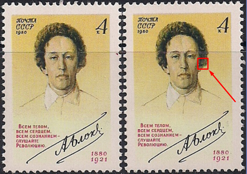 СССР 1980 год. 100 лет со дня рождения А.А. Блока. Разновидность - зеленое пятно на ухе