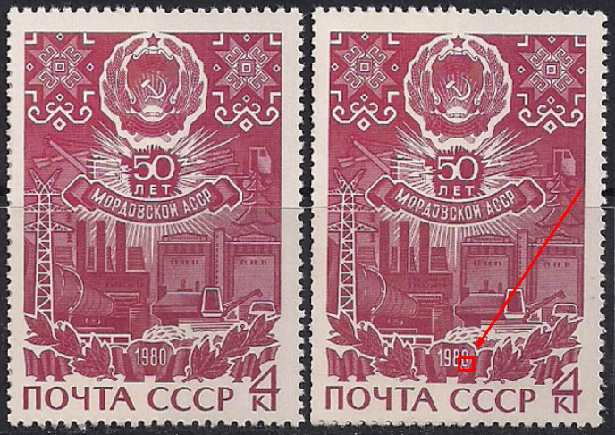 СССР 1980 год. 50 лет Мордовской АССР. 2 марки с разновидностью. Разбит "0" в "1980" На марке справа разбит 0 в "1980", где указано стрелкой