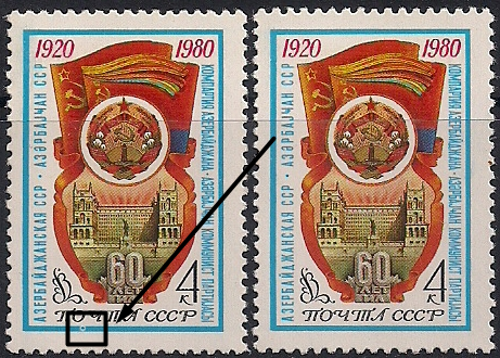 СССР 1980 год. 60 лет Азербайджанской ССР. Разновидность - "точка" на синей рамке