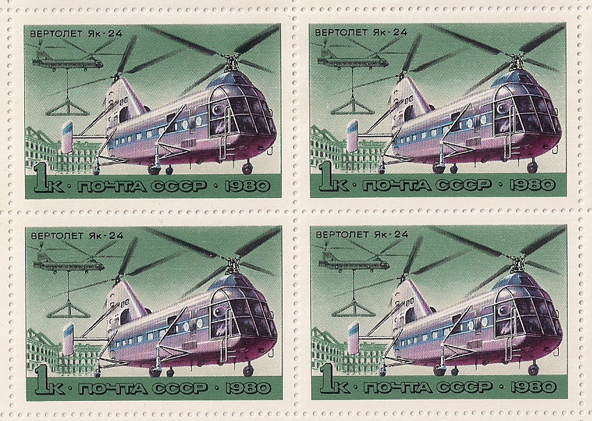 СССР 1980 год. История отечественного авиастроения. Вертолёт Як-24 (номинал 1к.). 1 квартблок
