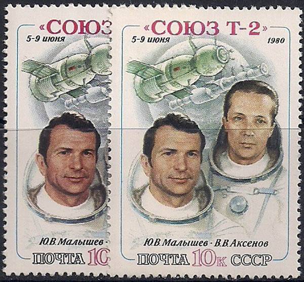СССР 1980 год. Полет корабля "Союз Т-2". Ю.В. Малышев и В.В. Аксенов (5040). Разновидность - левая марка темного цвета