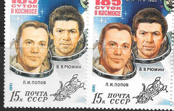 СССР 1981 год. 185 суток в космосе. Разновидность - красный и розовый текст, разный оттенок лиц
