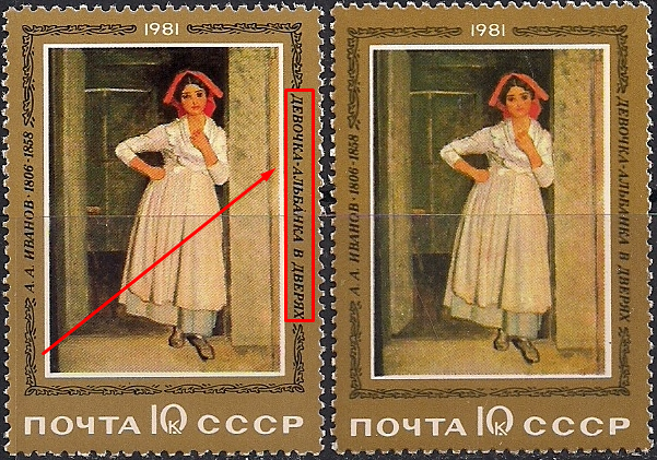 СССР 1981 год. Картина А.А. Иванова "Девочка-альбанка в дверях" (ном. 10к). Разновидность - разный цвет, жирный текст. (Ю) На марке слева красный цвет ярче, текст жирный