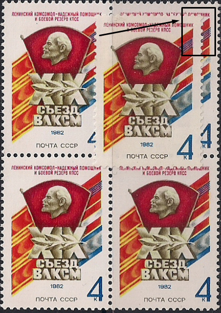 СССР 1982 год. 19-й съезд ВЛКСМ. Квартблок. Разновидность - сдвиг синего цвета вправо