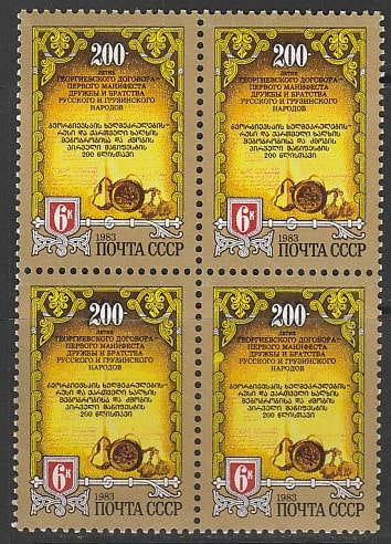СССР 1983 год. 200 лет Георгиевскому договору. Разновидность - в 4-й марке пятно в орнаменте, квартблок (5360)