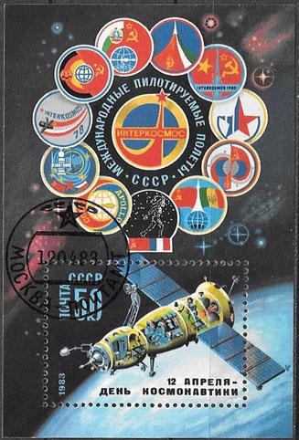 СССР 1983 год. День космонавтики. Эмблемы международных полетов. 1 гашеный блок
