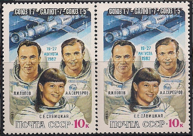 СССР 1983 год. Полёт Л.И. Попова, А.А.Сереброва и С.Е. Савицкой. Разновидность - насыщенный красный цвет левой марки