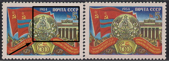 СССР 1984 год. 60 лет Союзным Республикам. Туркменская ССР (ном. 5к). Разновидность - смазан рисунокСССР 1984 год. 60 лет Союзным Республикам. Туркменская ССР (ном. 5к). Разновидность - смазан рисунок
