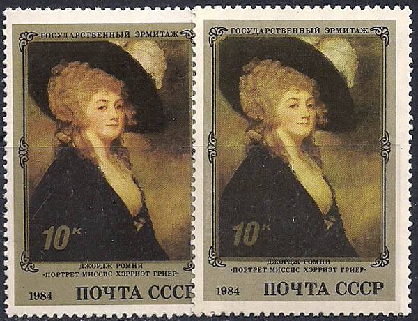 СССР 1984 год. Д. Ромни "Портрет миссис Хэрриэт Глиэр" (5416). Разновидность - темный цвет, фон левой марки (Ю)