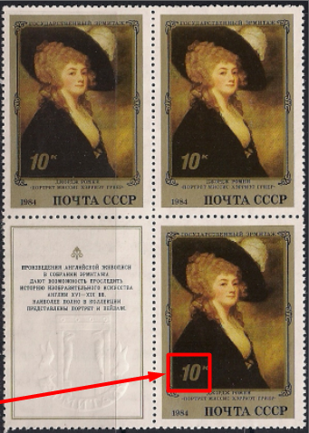 СССР 1984 год. Д. Ромни "Портрет миссис Хэрриэт Глиер" (ном. 10к). Квартблок. Разновидность - кружок перед номиналом