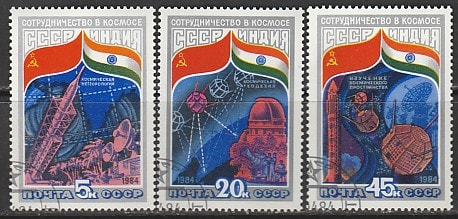 СССР 1984 год. Совместный советско - индийский космический полёт на корабле "Союз Т-11", 3 марки, № 5423-25 (гашёные)