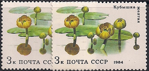 СССР 1984 год. Водные растения. Желтая кубышка (ном. 3к). Разновидность - яркий и бледный цвет