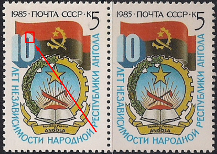 СССР 1985 год. 10 лет независимости Народной республики Ангола. Разновидность - синяя точка в цифре "0" в "10"
