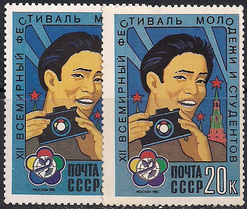 СССР 1985 год. Юноша с фотоаппаратом (ном. 20к). Разновидность - синий и светлый цвет и фон