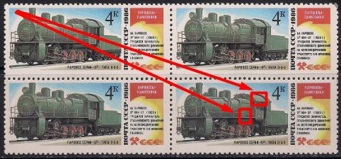 СССР 1986 год. Паровоз-памятник серии ЭУ (ном. 4к). Квартблок. Разновидность - красные точки на тендере и крыше