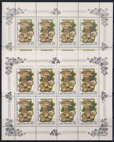СССР 1986 год. Желчный гриб. 15 к, (5658). Малый лист. Разновидность - темный цвет и фон на нижнем листе, светлый на верхнем (Ю)