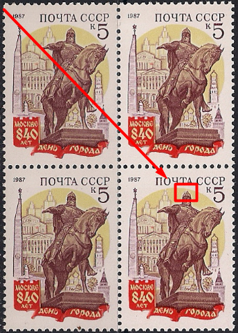 СССР 1987 год. 840 лет Москве. Памятник Ю. Долгорукову. Квартблок. Разновидность - разбит шлем у Ю. Долгорукова сверху