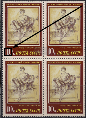 СССР 1987 год. А. Дюрер "Правосудие" (ном. 10к). Квартблок. Разновидность - пробит "0" в "10к"