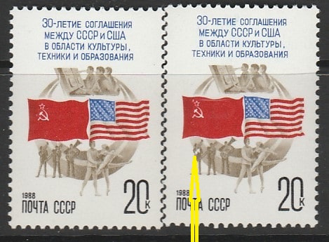 СССР 1988 год. 30 лет подписания первого соглашения между СССР и США. Разновидность - "ноты у музыканта", 2 марки