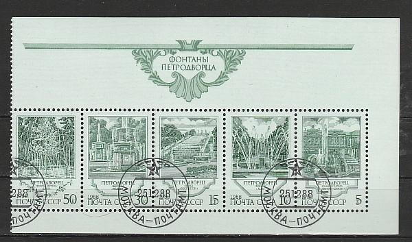 СССР 1988 год, Фонтаны Петродворца, сцепка справа- налево . гашеная . 50/ 30. 15. 10 . 5 . . поле справа