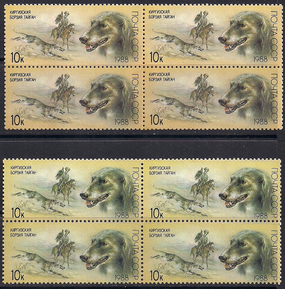 СССР 1988 год. Киргизская борзая тайган. Квартблок (10 коп). Разновидность - разный цвет