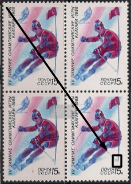 СССР 1988 год. Олимпиада в Калгари. Слалом (ном. 15к). Квартблок. Разновидность - короткая стойка флажкаСССР 1988 год. Олимпиада в Калгари. Слалом (ном. 15к). Квартблок. Разновидность - короткая стойка флажка