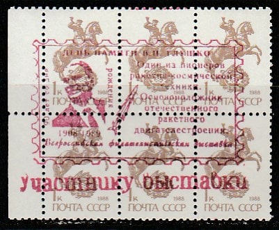 СССР 1988 год. Стандарт (ном. 1 к.). НДП: "Всероссийская филвыставка. День памяти В.П. Глушко. Один из пионеров ракетно-космической техники", 6 марок.