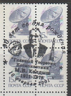 СССР 1988 год. Стандарт (ном. 15 к.) СГ: 90 лет со дня рождения теоретика космонавтики М.В. Келдыша, 10.02.2001 год, квартблок (чёрная)